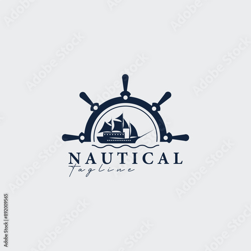 © pramzstadobe, Obraz premium steering wheel ship wave logo vector illustration design