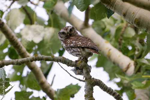 Fototapeta premium Steinkauz mit Beute auf einem Baum