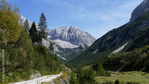 Fototapeta premium Stempeljoch Wilde Bande Steig at Karwendel mountains on Karwendel Hohenweg, Austria