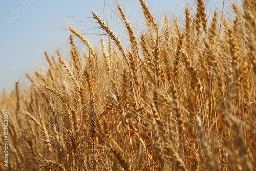 © Vladimir, Fototapeta premium Stems with grains. A huge field of ripening wheat under the bright sun.