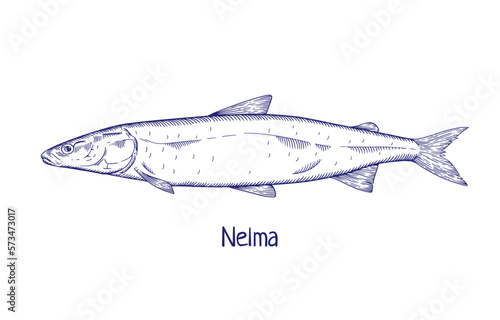 Fototapeta premium Stenodus nelma, vintage water fauna drawing. Engraved outlined sea, etched...