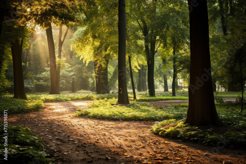 © Alisa, Naklejka premium Step into a world of calm and tranquility with this sunlit park scene featuring green trees and a serene atmosphere. AI generative.