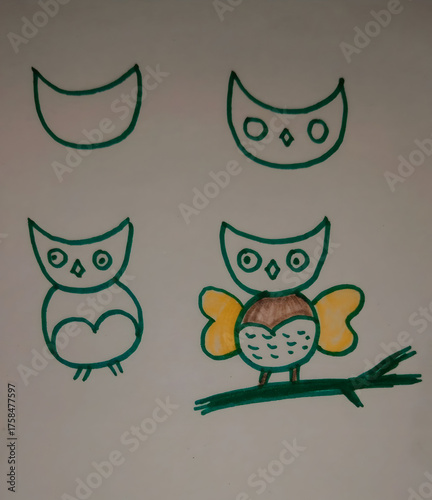 Fototapeta premium Stepbystep drawing guide showcasing how to draw a cartoon owl with simple shapes and colors on white background for kids and beginners tutorial art project