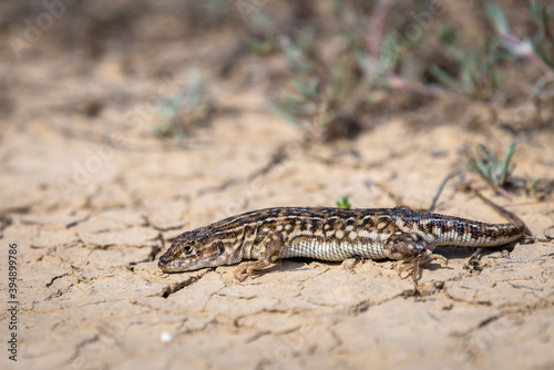 Naklejka premium Steppe runner lizard or Eremias arguta close on dry ground