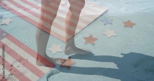 Fototapeta premium Stepping bare feet on sandy painted surface at beach edge, with striped towel, star-shaped cutouts