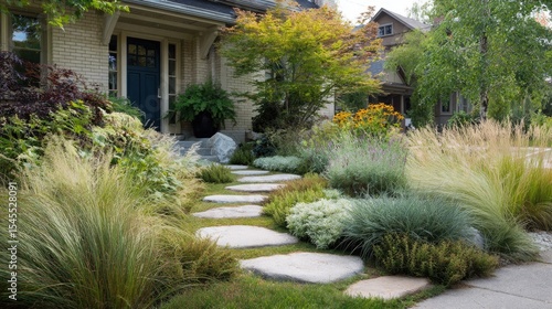 © Sampao, Naklejka premium Stepping stone path set in grass leading to a front door surrounded by ornamental plants