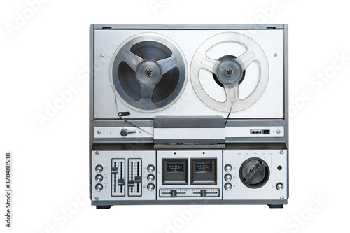 © Luca9257, Obraz premium Stereo tape deck recorder player with reels on background.