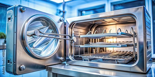 © Sujid, Obraz premium Sterilized dental instruments inside a sterilizer with blurred background, sterile, dental tools, equipment