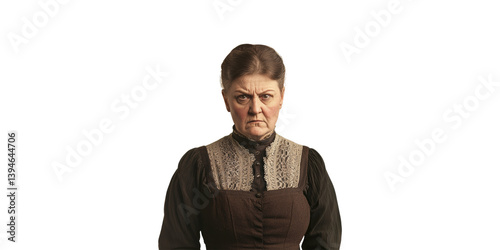 Fototapeta premium Stern Elderly Woman In Vintage Attire. Expression Of Disapproval And Authority Isolated On Transparent Background