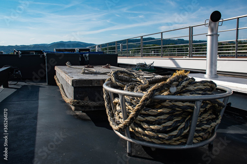 © Horizon Apex Studio, Obraz premium Stern of cruise ship showcasing nautical equipment in the winter harbour