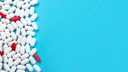 © bit24, Obraz premium Sterta pigułek na niebieskim tle