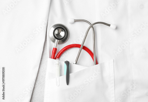 © New Africa, Fototapeta premium Stethoscope and pens in pocket of white doctor’s coat on light background, top view