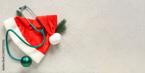 Obraz premium Stethoscope with Christmas tree branches and Santa hat on light background