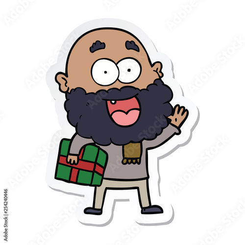 Fototapeta premium sticker of a cartoon crazy happy man with beard and gift under arm