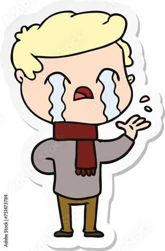 Fototapeta premium sticker of a cartoon man crying wearing winter scarf