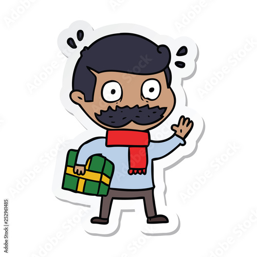 Fototapeta premium sticker of a cartoon man with mustache and christmas present