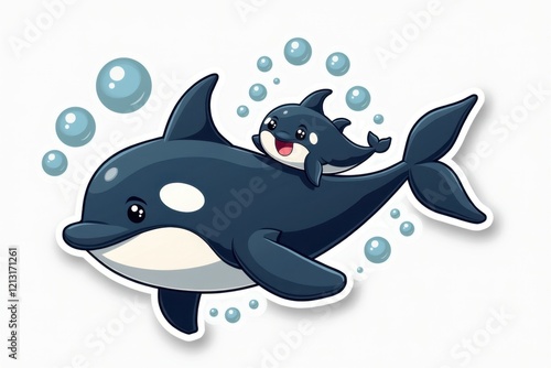Fototapeta premium Sticker with a playful baby killer whale swimming alongside its parent, surrounded by glowing bubbles on a white background, joyful aquatic design concept.