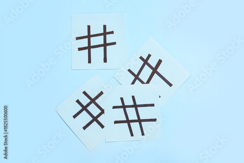 Obraz premium Sticky notes with hashtags on blue background