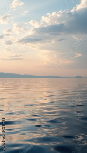 Fototapeta premium Still, glassy lake surface, gentle ripples reflecting sky, day, serenity