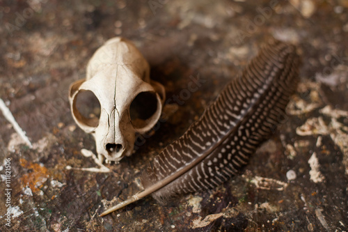 © zdyma4, Naklejka premium Still life. Cat's skull and a quill on gray sloppy surface