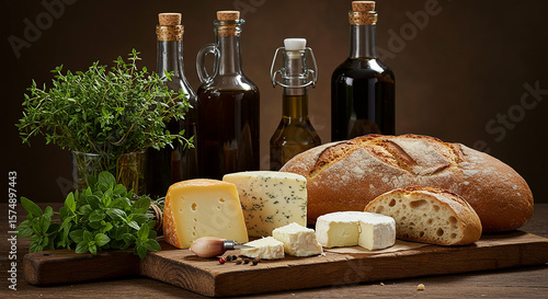 Naklejka premium Still life featuring cheese bread oil herbs and a wooden board arranged on a...