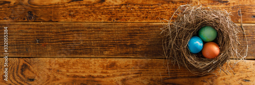 Fototapeta premium Still life of easter eggs in a bird's nest on a wooden background. Rustic. Easter celebration concept. Copy space. Flat lay. Banner.