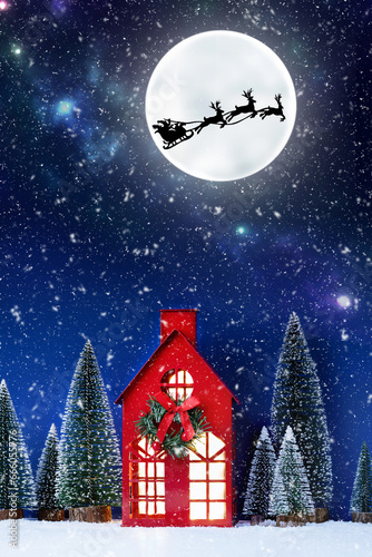 Naklejka premium Still life of red Christmas toy house and Santa Clause sleigh over full moon....