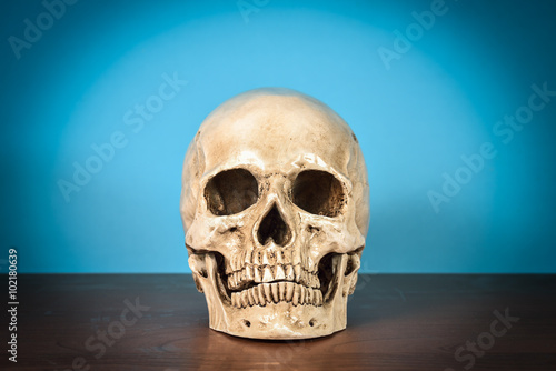 © maonakub, Obraz premium Still life white human skull on wooden table