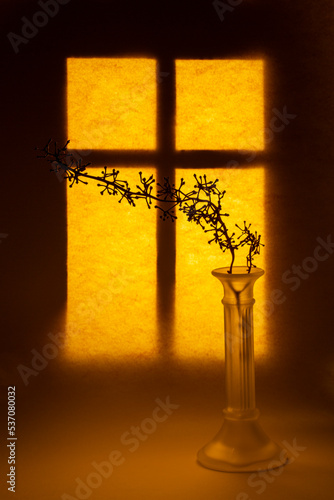 © i_valentin, Naklejka premium Still life with a branch in a glass vase on a window background
