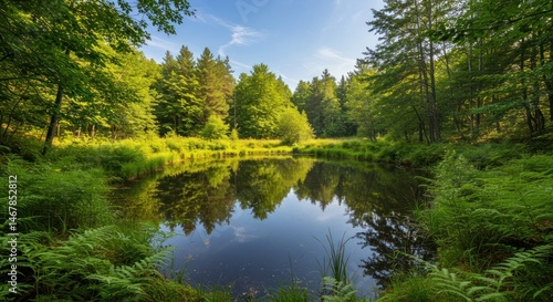© ngalong project, Fototapeta premium Still water reflecting trees in a forest on a sunny day.