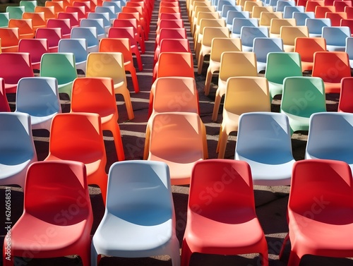 Fototapeta premium Stille Kontraste: Leere Stühle in leuchtenden Farben