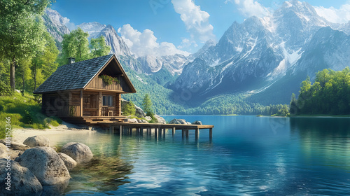 Fototapeta premium Stilt house on lake beach in mountain valley. Nature landscape with small...