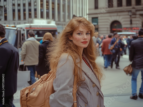 © Cedric, Fototapeta premium Stilvolle Frau in Sonnenbrille vor belebter Stadtkulisse