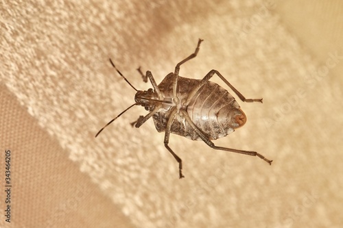 © Gudellaphoto, Obraz premium Stink bug crawling on a window, viewed from under
