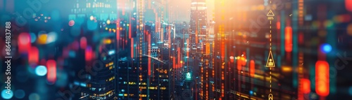 Obraz premium Stock chart, city skyline, close up, focus on, copy space, vibrant colors,...