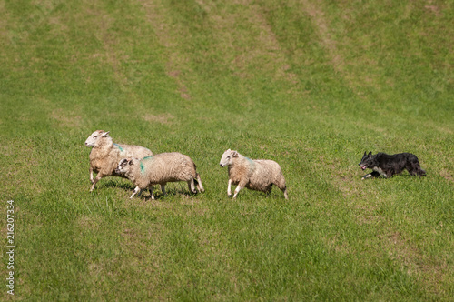 © hkuchera, Fototapeta premium Stock Dog Runs Sheep (Ovis aries) Right on Course