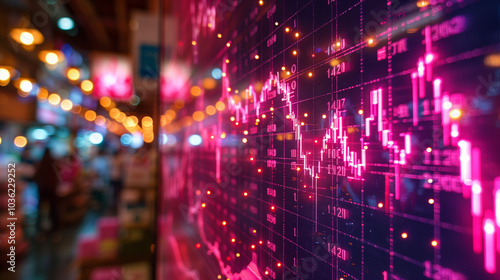 Fototapeta premium Stock market data display with glowing pink graphs and blurred background of a busy trading environment