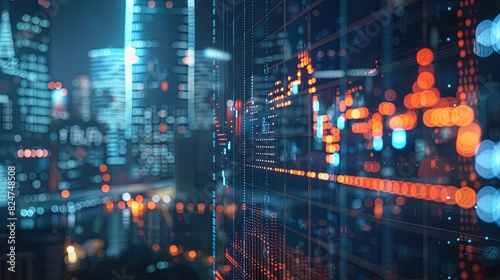 © EnelEva, Fototapeta premium stock market data on digital screen, blue and orange color theme, city background