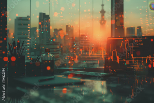 © PHAISITSAWAN, Fototapeta premium Stock market graph on background with desk and personal computer financial analysis concept.