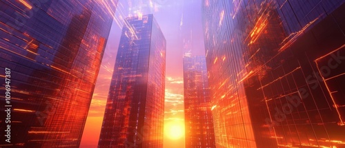 Fototapeta premium Stock market graph overlaying skyscrapers at sunset in urban environment...
