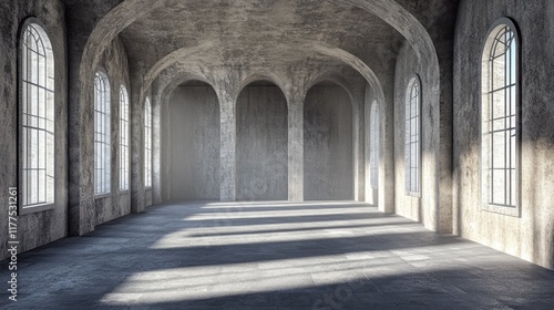 © ddaremmth, Naklejka premium stock photo features a realistic 3D rendering of an old stone building room with concrete elements, textured walls, and an architectural design, creating a unique and atmospheric interior space