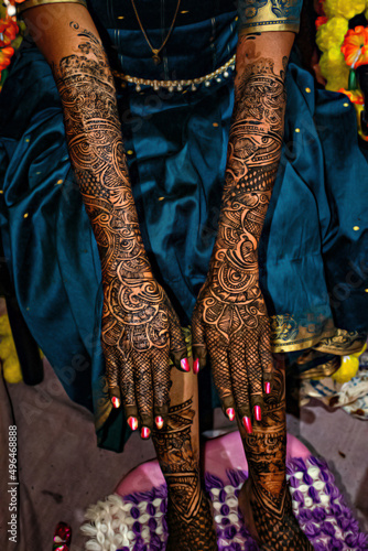 © Vinodkumar, Fototapeta premium Stock photo of beautiful Indian bridal showing her henna hands, applied on the occasion of wedding at Kolhapur, Maharashtra, India. Henna symbolizes positive spirit and good luck for bride and groom.