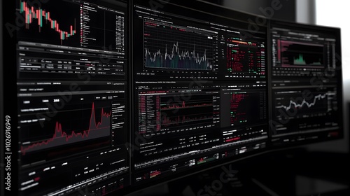 Fototapeta premium Stock trading interface displaying multiple charts and financial data across...