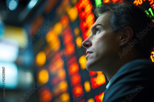 © Michael, Obraz premium Stockbroker looking at electronic board displaying real-time stock market data, analyzing financial trends and making investment decisions