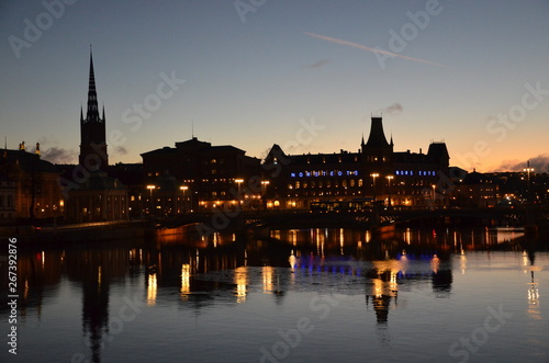 Naklejka premium Stockholm city street panorama city stone blocks square shop road pavement signs road city streets city lights city mood