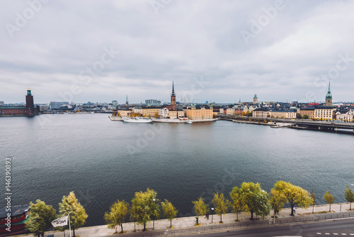 © krugli, Fototapeta premium Stockholm panorama with Old Town Gamla Stan and Centralbron bridge view from Monteliusvagen in Sodermalm island. Stockholm skyline with City Hall, Riddarholm Church and Old German Church, Sweden.