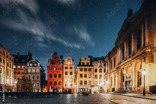 Naklejka premium Stockholm, Sweden. Famous Old Colorful Houses, Swedish Academy and Nobel Museum In Old Square Stortorget In Gamla Stan. Famous Landmarks And Popular Place.
