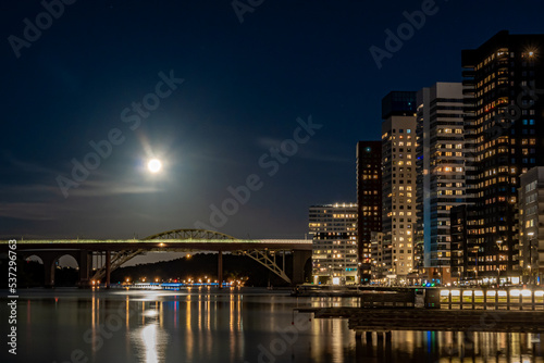 © Alexander, Naklejka premium Stockholm, Sweden The Liljeholmskajen district at night with a full moon.