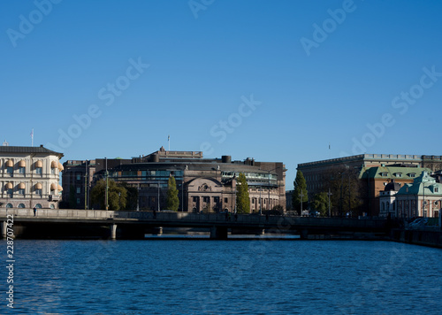 Obraz premium Stockholm water front with landmarks, boats an autumn day with blu sky and...
