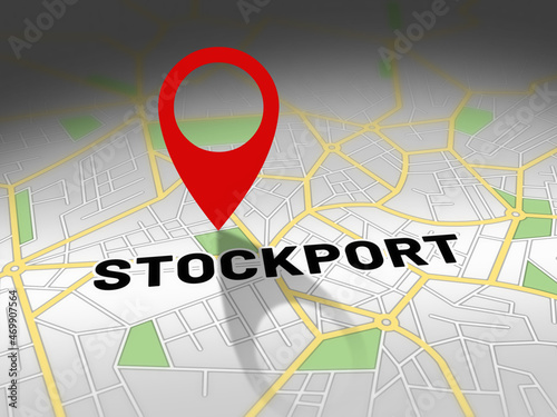 © DistantPixel, Fototapeta premium Stockport on map with red GPS navigation pin. United kingdom location with generic map background.